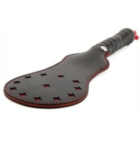 Le Paddle en simili Star noir-rouge 35cm est conçu pour ceux qui aiment ajouter une touche d'originalité à leurs jeux. Avec sa partie haute de 17 x 10cm, ce paddle affiche une forme arrondie très chic et des étoiles rouges en surface pour un visuel accrocheur.