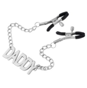 Il s'agit de pinces-tétons en métal super originales. La petite touche fun? Une plaque avec le mot DADDY (7 x 2.5cm) pour une pointe d'humour et de complicité. Elles sont ajustables pour s'adapter parfaitement à toutes les morphologies et les extrémités sont protégées pour un meilleur confort. La longueur totale est de 40cm, de quoi laisser la place à l'imagination!