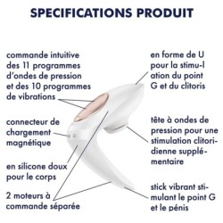 Le Satisfyer Pro 4 est avant tout un stimulateur clitoridien de pointe, doté de 11 programmes d'ondes de pression pour des sensations inédites. Mais ce n'est pas tout ! Il fait également office de stimulateur de pénis et de point G grâce à ses 10 programmes de vibration. Un double plaisir qui promet des moments intenses et complices à deux.